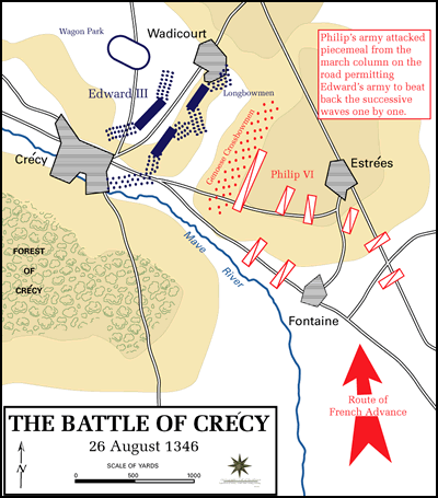However, to get to the English the French knights had to ride over the Genoese crossbowmen that they hired. What had actually happened was the crossbowmen misjudged the distance and shot too early. The English longbowmen counter-attacked; and with their greater rate of fire and mobility (they occupied the high-ground). The crossbowmen ran in retreat. The French knights then ran a cavalry charge through their Genoese allies to get at the English. By the time the French cavalry reached the hill below where the English longbowmen were located the knights were tired. They had to get off their horse in order to climb the muddy hill to get at the English. As the French climbed the hill they were absolutely cut down by the longbowmen; moreover, the English used cannon and halbidiers to strike at the French from a distance. During the battle it is estimated that as much as 1/3 of the nobility of France was killed.